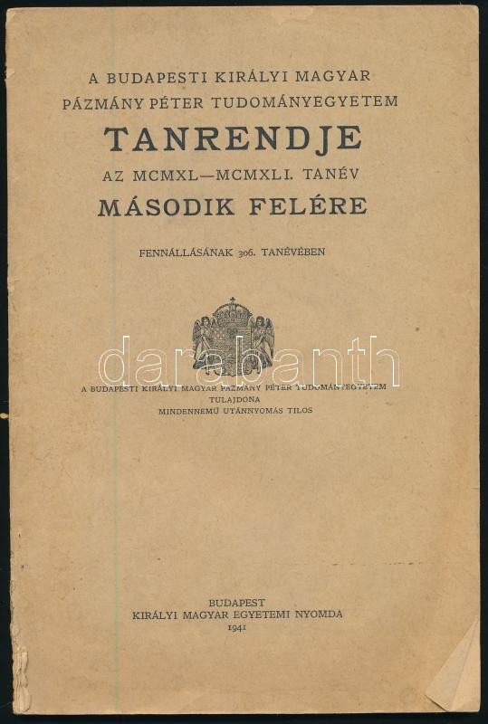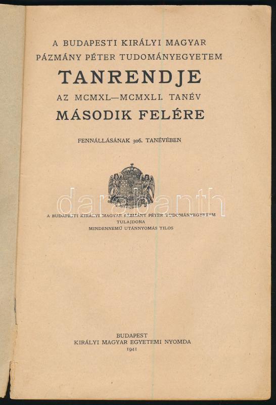 1941 A Budapesti Királyi Magyar Pázmány Péter Tudományegyetem tanrendje az MCMXL-MCMXLI. tanév második felére. Bp., 1941, Kir. M. Egyetemi Nyomda. Kiadói papírkötés, szakadt borítóval, a gerinc alsó részén hiánnyal, a hátsó borító foltosl.
