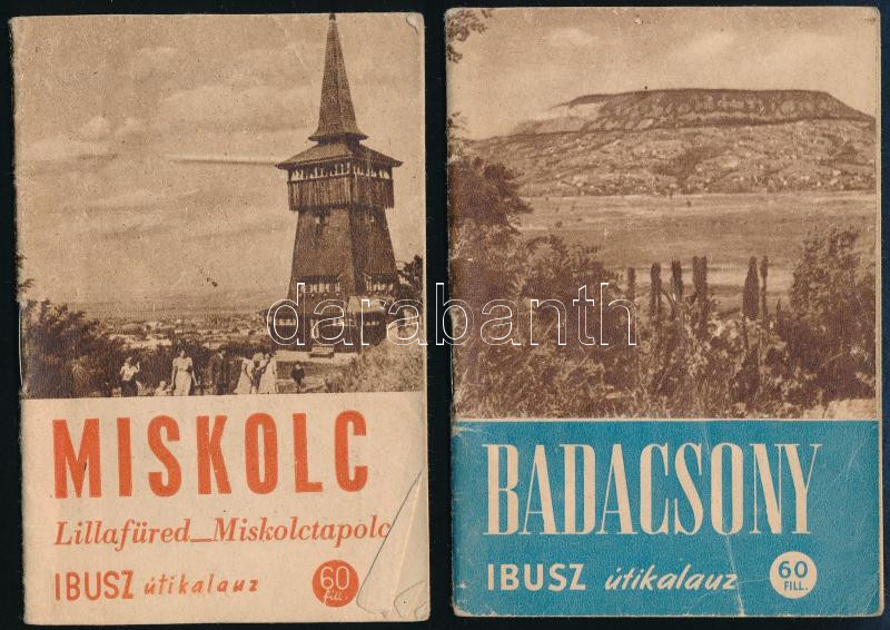 2 db IBUSZ útikalauz: Miskolc.; Badacsony. IBUSZ útikalauzok 8. és 22. Bp., 1952-1953, Közlekedés- és Mélyépítéstudományi Könyv- és Folyóiratkiadó Vállalat, 15+(1) p.; 23+(1) p. Kiadói tűzött papírkötés. Megjelent 2500 példányban.