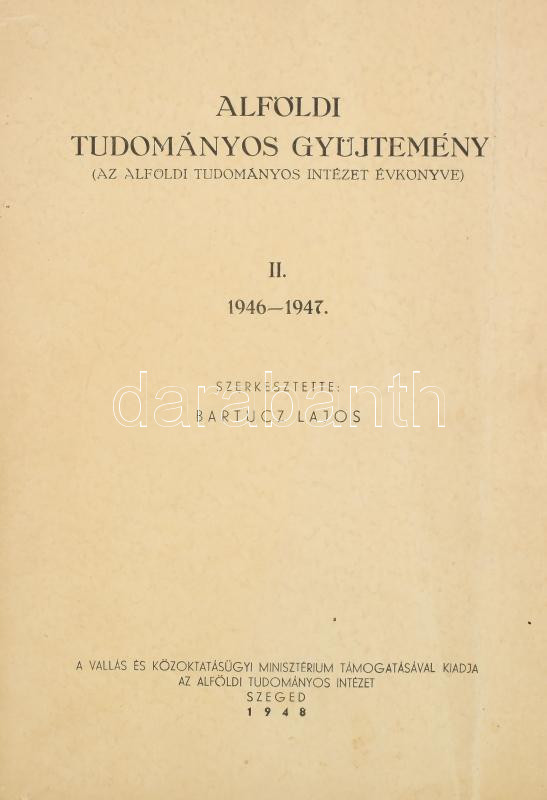 Alföldi tudományos gyűjtemény (Az Alföldi Tudományos Intézet évkönyve) II. 1946-1947. Szerk.: Bartucz Lajos. Szeged, 1948, Alföldi Tudományos Intézet, 2 sztl. lev.+ 342 p. Kiadói papÃrkötés, kissé viseltes borÃtóval, intézményi bélyegzÅ‘vel, a lapok egy részén ázásnyomokkal.