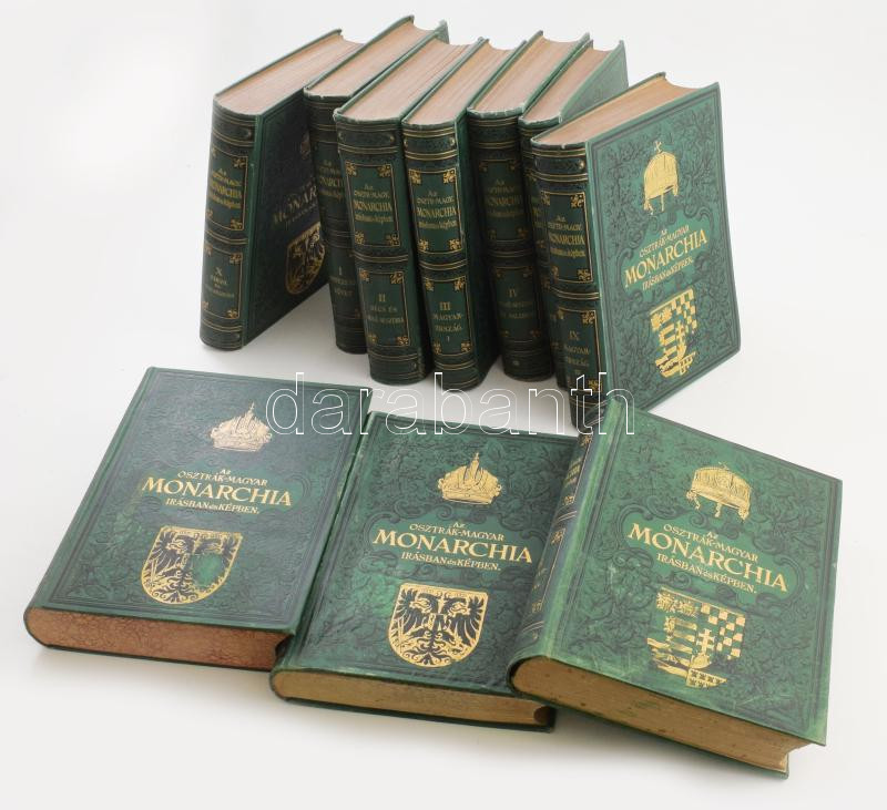 Az Osztrák - Magyar Monarchia írásban és képben I-XXI. kötet. Bp., 1887-1901, Magyar Királyi Államnyomda. Szövegközti és egész oldalas képekkel, térképekkel gazdagon illusztrált. Teljes, egységes sorozat. Kiadói, aranyozott, dombornyomásos, zöld egészvászon kötésben, változó állapotban, közte kopott, kissé kopott, kissé foltos borítókkal, öt kötet foltos borítóval, ezek közül 4 foltos, hullámos lapokkal, további öt - hat kötetben foltos lapokkal, 1 színes litografált tábla kijár (XVI. köt.) KIZÁRÓLAG SZEMÉLYES ÁTVÉTEL, NEM POSTÁZZUK!