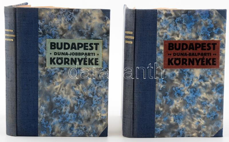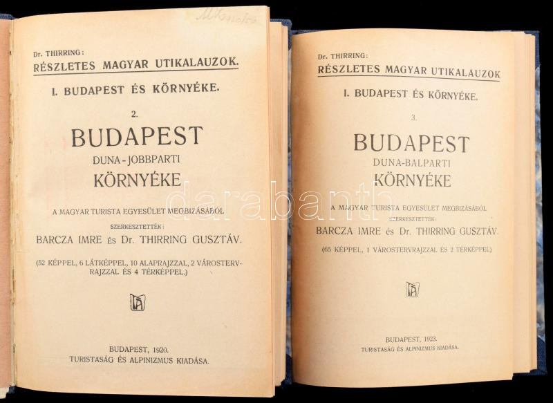 Budapest Duna-Jobbparti és Duna-balparti környéke. Két kötet.. Szerk.: Barcza Imre és Thirring Gusztáv. Dr. Thirring: Részletes Magyar Utikalauzok I. Budapest és környéke. 3. köt. Bp., 1920-23, Turistaság és Alpinizmus, 1 (kihajtható panorámakép) t. + 4+268+4 p.+5 (térképek, közte a nagyméretű kihajtható térkép-melléklettel is!) t.; 2 sztl. lev.+ 204+II p.+2 (térképek, az egyik kihajtható) t. Korabeli félvászon kötésben, a térképeken ragasztások.