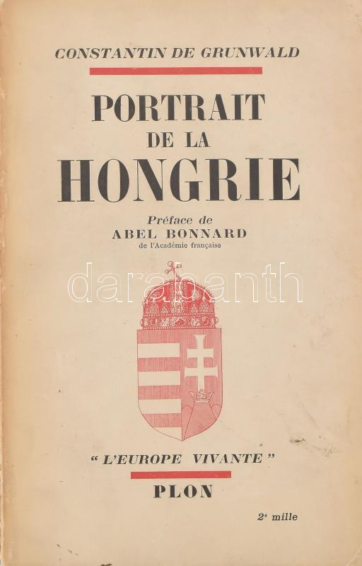 Constantin de Grunwald: Portrait de la Hongrie. Préface de Abel Bonnard. [Paris], 1939, Librairie Plon, 6+V+1+241+3 p.+8 t. Fekete-fehér fotókkal illusztrált. Francia nyelven. Kiadói papírkötés.