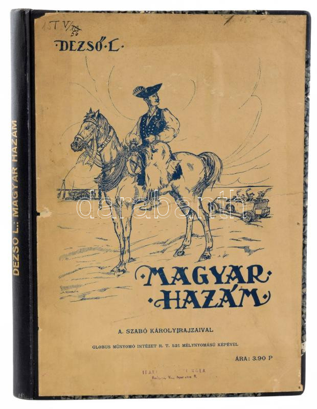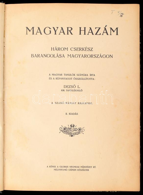 Dezső Lipót: Magyar hazám. Három cserkész barangolása Magyarországon. A magyar tanulók számára írta és a képanyagot összeáll.: - - . A. Szabó Károly rajzaival. Szombathely-Bp., [1935], Martineum Rt. - Globus-ny., 84 p.+ 80 (fekete-fehér képek) t. Második kiadás. Gazdag egészoldalas képanyaggal illusztrálva. Átkötött, kissé viseltes, sérült.