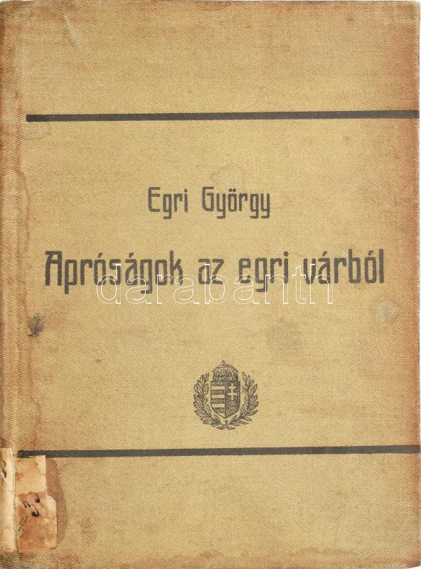 Egri György: Apróságok az egri várból. Bp.,én.,Singer és Wolfner,(Fráter és Társa-ny.), 48 p. Második kiadás. Kiadói egészvászon-kötés, foltos, kopott borítóval, régi intézményi bélyegzésekkel, a gerincen címkenyomokkal.