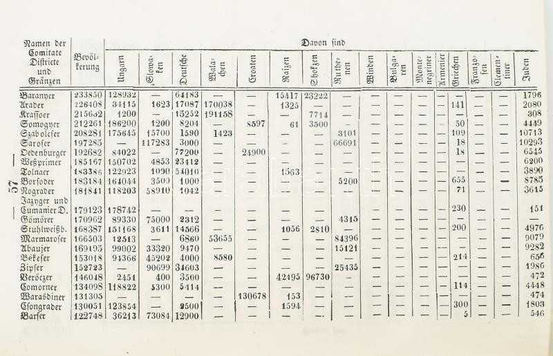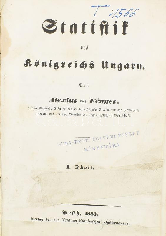 Fényes von Alexius [Fényes Elek]: Statistik des Königreichs Ungarn.I. Theil. Pesth, 1843., Trattner -Károlyi, VII+331 p.+1 (kihajtható táblázat) t. Német nyelven. Korabeli félvászon-kötés, kopott borítóval, a gerincen kis sérüléssel, foxing foltos lapokkal, javított címlappal, a címlapon régi bélyegzéssel.