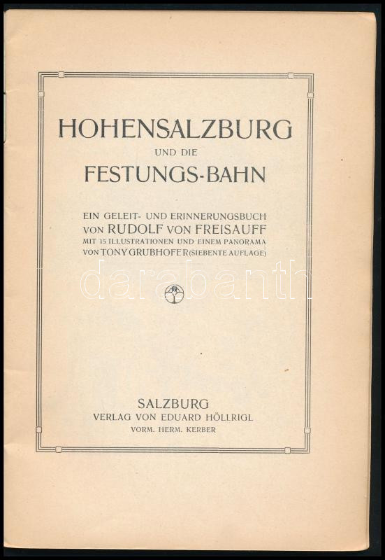 Freisauff, Rudolf von: Hohensalzburg und die Festungsbahn. Ein Geleit- und Erinnerungsbuch von - - . Mit 15 Illustrationen und einem Parnorama von Tony Grubhoffer. Salzburg, é.n. (cca 1910-1920), Eduard Höllrigl, 39+(1) p.+ 1 (kihajtható) t. Német nyelven. Kiadói tűzött papírkötés, kissé viseltes borítóval, belül jó állapotban.