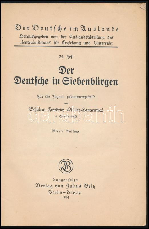 Friedrich Müller-Lagenthal: Der Deutsche im Siebenbürgen. Der Deutsche im Auslande. 24. heft. Berlin - Leipzig, 1934, Julius Beltz, 56 p. Német nyelven. Kiadói papírkötés.