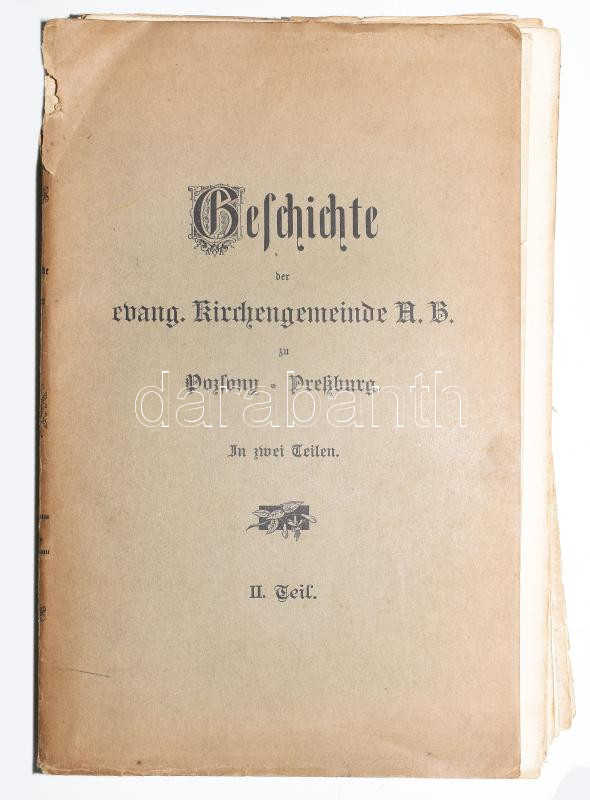 Geschichte der evangelischen Kirchengemeinde A.B. zu Pozsony-Pressburg, Theil II (German Edition) Pozsony-Pressburg, 1906 Evangelische Kircheng. 370 p. Szétvált fűzéssel, papírborítóval, sérült gerinccel.