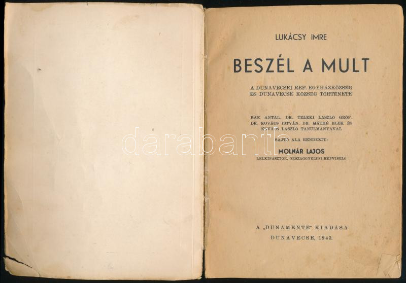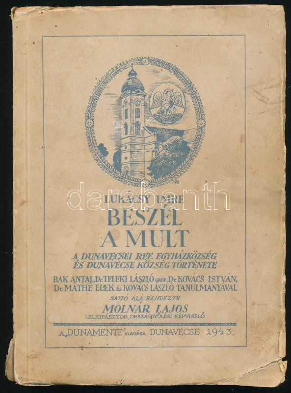 Lukácsy Imre: Beszél a múlt. A dunavecsei ref. egyházközség és Dunavecse község története. Bak Antal, Teleki László, Kovács István, Máthé Elek és Kovács László tanulmányával. Sajtó alá rendezte: Molnár Lajos. Dunavecse, 1943, "Dunamente", 175+1 p. 1 (térképvázlet) t.+18 (fekete-fehér) t. Kiadói papírkötés, kissé sérült, foltos borítóval, kissé sérült gerinccel, 1-2 kijáró lappal.
