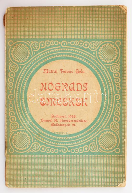 Mátrai Ferenc Béla: Nógrádi emlékek. Bp., 1928., Lampel R. (Wodianer F. és Fiai) Rt., (Bethánia-ny.), 60 p. A borító Wesely Norbert munkája. Kiadói papírkötés, szakadt, foltos borítóval, néhány szamárfüles lappal.