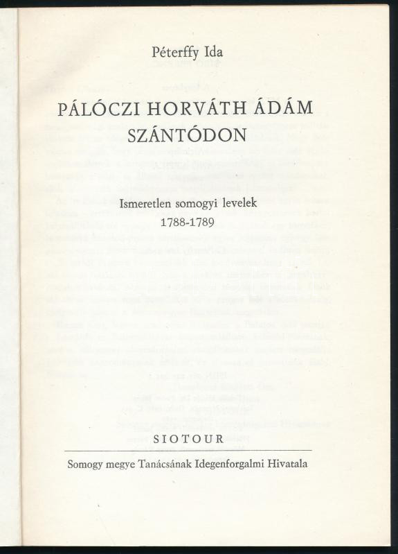 Péterffy Ida: Pálóczi Horváth Ádám Szántódon. Ismeretlen somogyi levelek 1788-1789. Szántódi Füzetek I. 1980, Siotur. Kiadói papírkötés, jó állapotban.