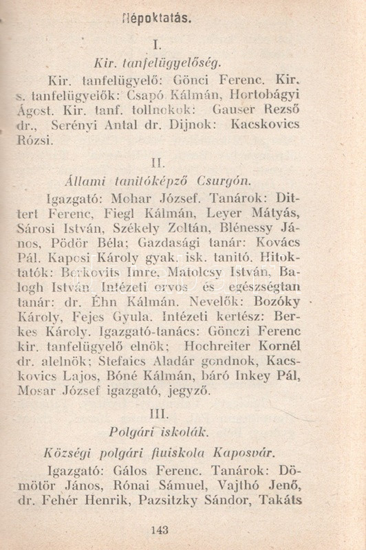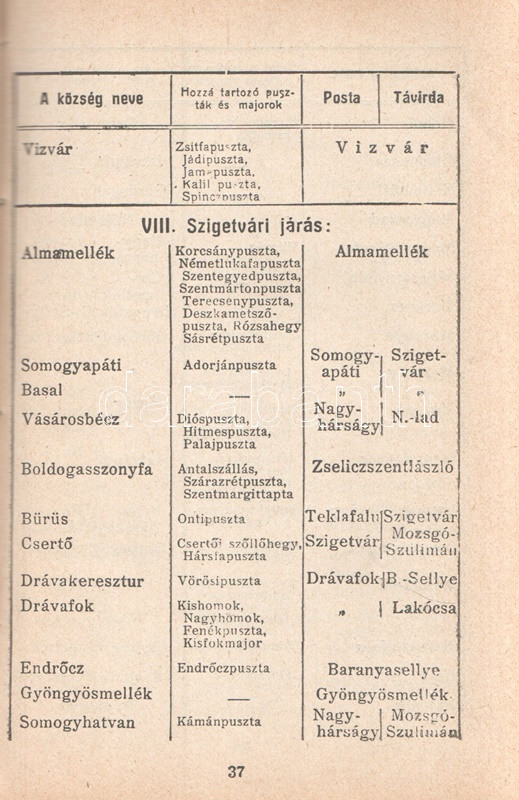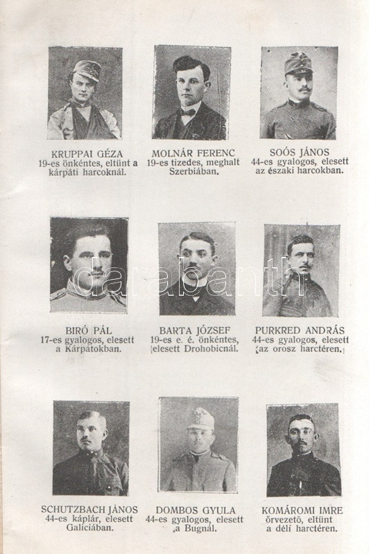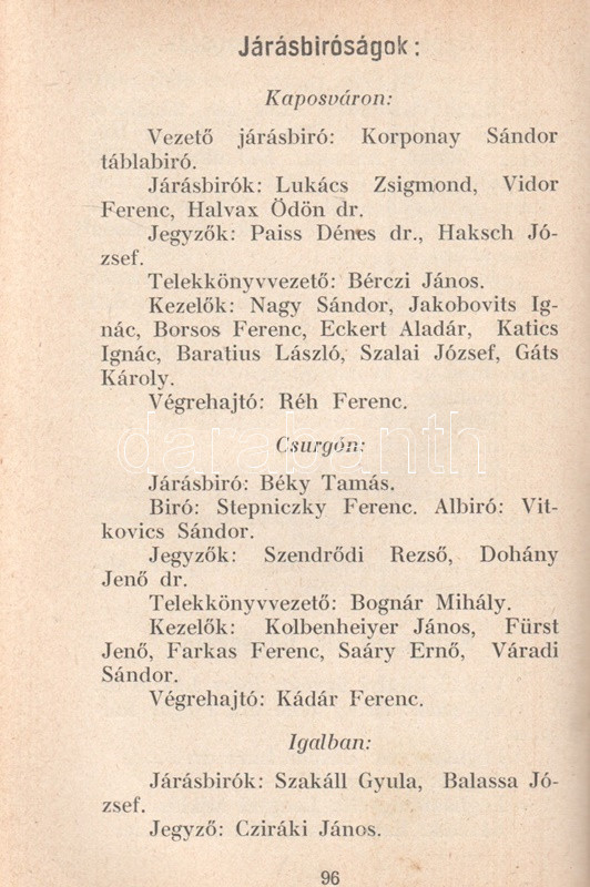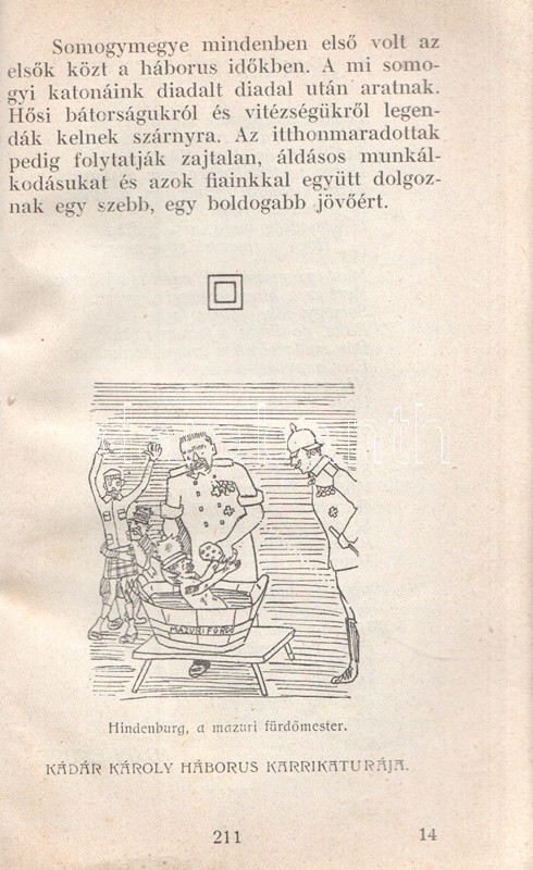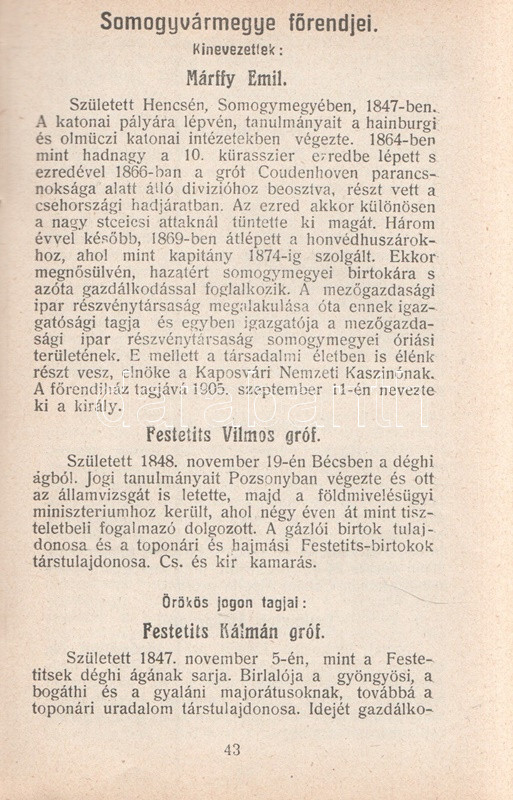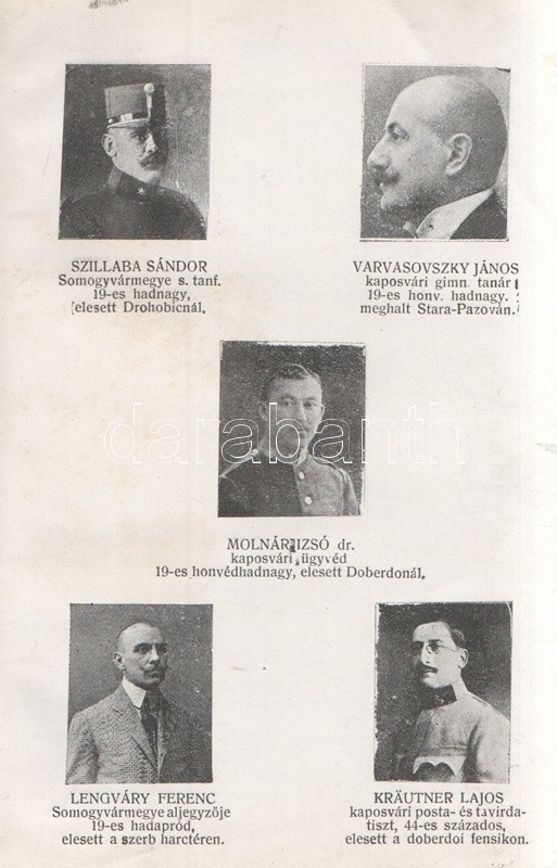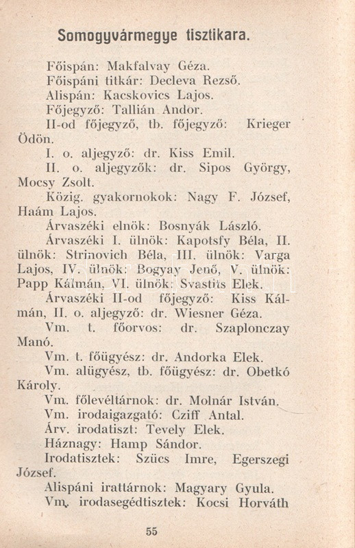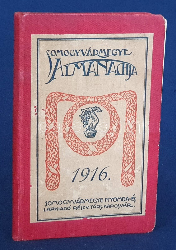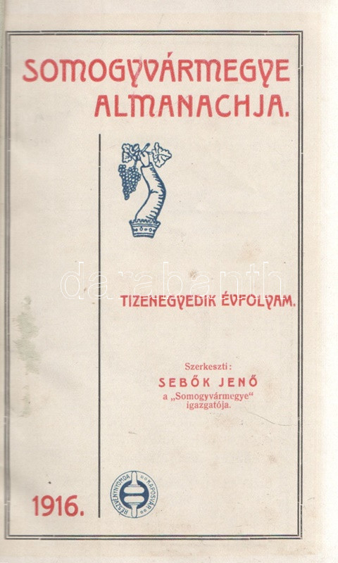 Somogyvármegye Almanachja 1916. Tizenegyedik évfolyam. Szerkeszti Sebők Jenő. Kaposvár, 1916. Somogyvármegye Nyomda- és Lapkiadó Rt. [4] + 223 + [25] p. + 9 t. A naptári rész után posta- és távírdai díjszabás, a postacím pontosságát célzó járási beosztás, majd az évkönyv törzsanyagát jelentő személyi anyag a vármegye főrendjeiről, tiszti karáról, egyházi, pénzügyi vezetéséről, gazdasági vállalkozásairól és iskolahálózatáról, különös tekintettel Kaposvár városára. A néhány háborús szövegközti rajzzal illusztrált irodalmi rész a folyó háborúban elesett somogyi hősöknek állít emléket, illetve a megye politikai lapját, a Somogyvármegyét méltatja. A 223. oldal után a helyi vállalkozások képes hirdetési anyaga. Illusztrált kiadói egészvászon kötésben. Jó példány.