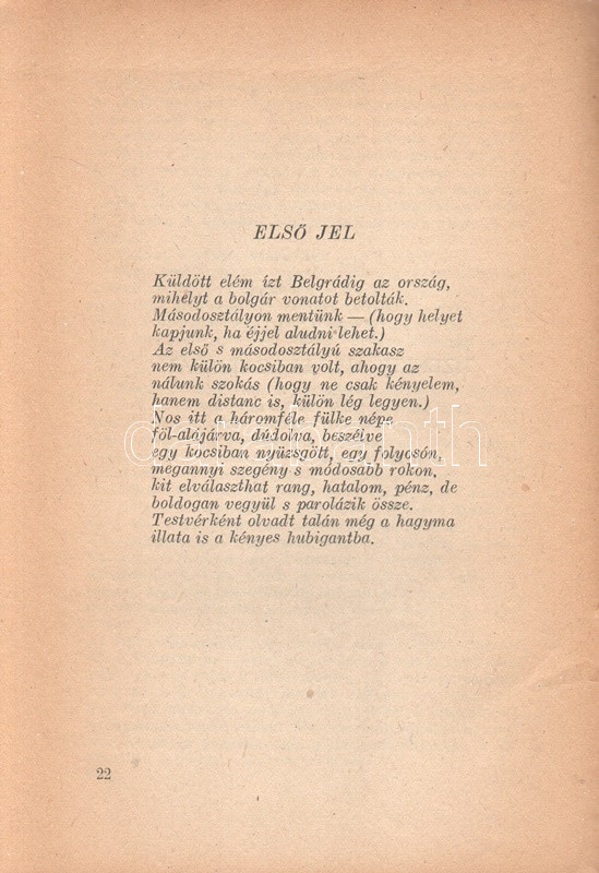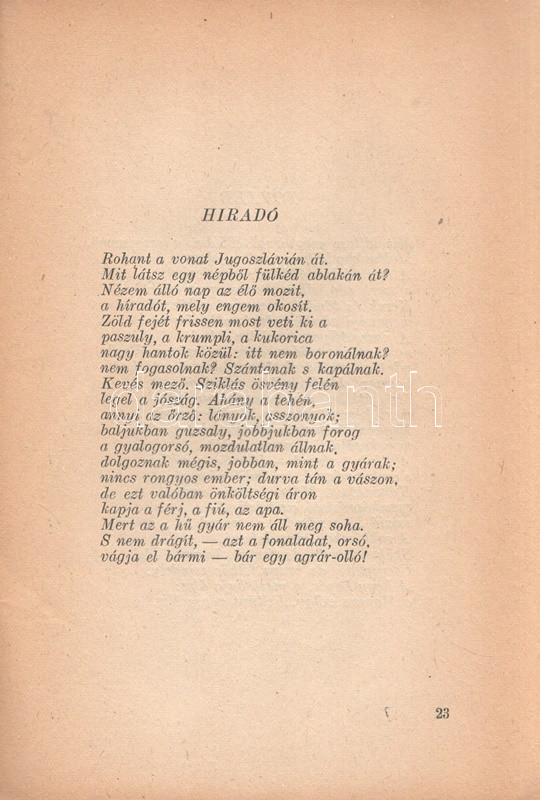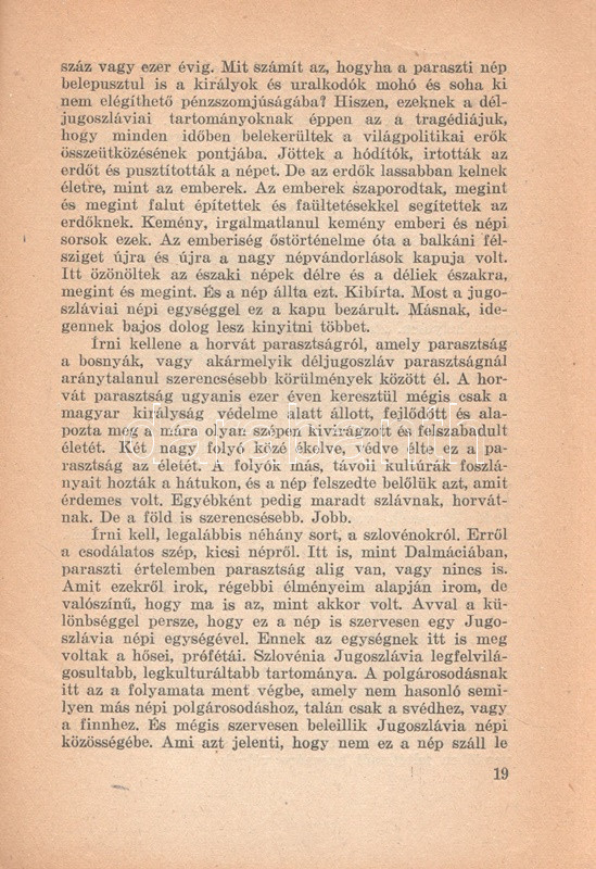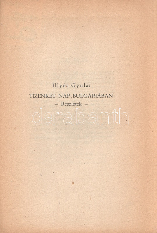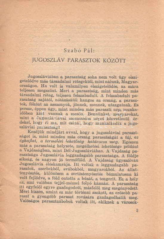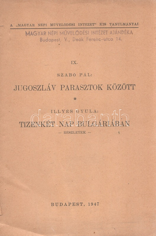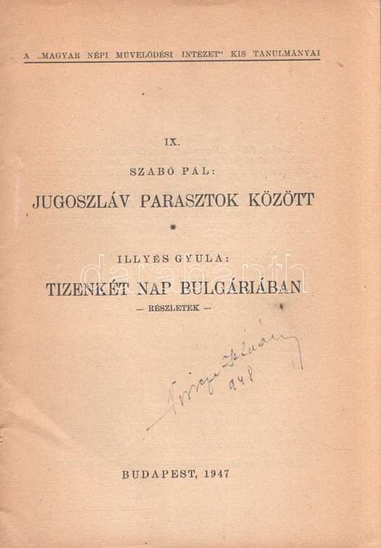 Szabó Pál: Jugoszláv parasztok között. - Illyés Gyula: Tizenkét nap Bulgáriában (részletek). Budapest, 1947. Magyar Népi Művelődési Intézet (Sylvester Rt. ny.) 28 p. Egyetlen kiadás. Kiadványunk a balkáni paraszti kultúra kortárs állapotának rövid ismertetését célozza, publicisztikai, illetve verses formában - Szabó Pál író, újságíró, parasztpárti politikus (1893-1970), illetve Illyés Gyula tollából. A címlapon régi tulajdonosi bejegyzés, az első borítófedélen kiadói bélyegzés. (A Magyar Népi Művelődési Intézet kis tanulmányai, IX.) Prov.: Vincze István. [Vincze István (1922-1982) néprajztudós, 1955-től a Néprajzi Múzeum munkatársa, 1980-től osztályvezetője. Főként szőlészet- és borászattörténettel foglalkozott.] Fűzve, enyhén sérült kiadói borítóban.