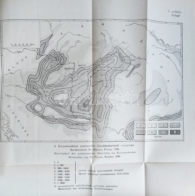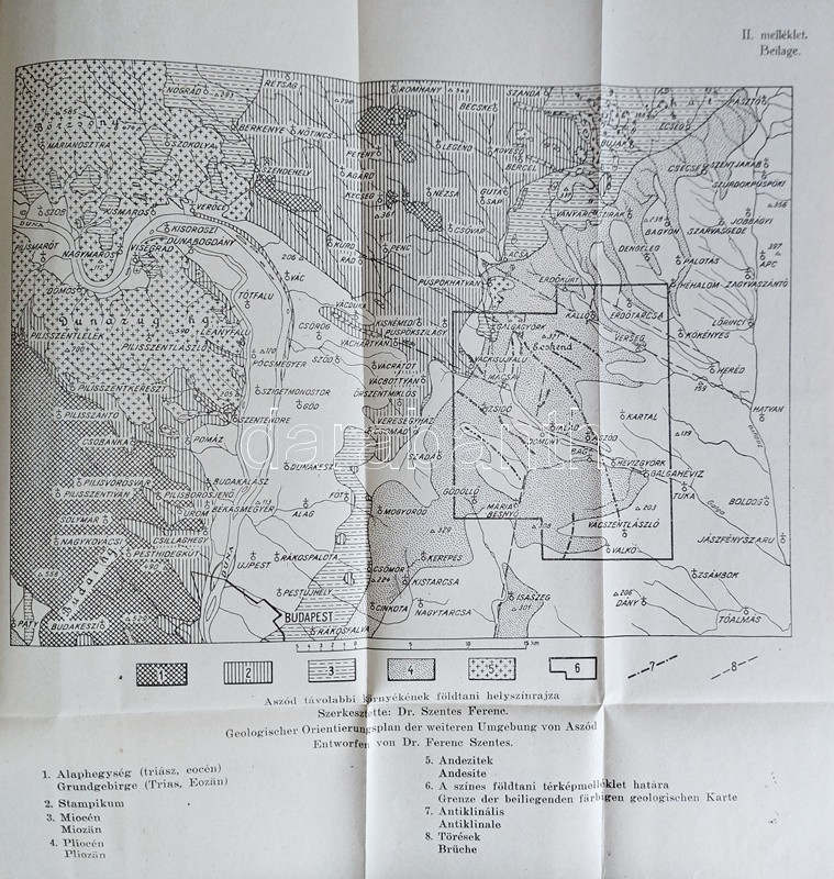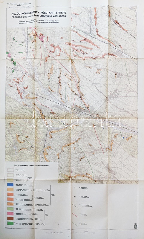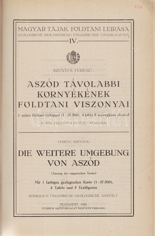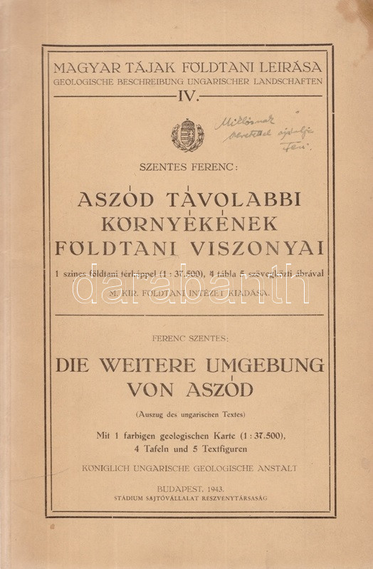 Szentes Ferenc: Aszód távolabbi környékének földtani viszonyai. 1 színes földtani térképpel (1:37.500), 4 tábla 5 szövegközti ábrával. (Dedikált.) Die weitere Umgebung von Aszód. Auszug des ungarischen Textes. Budapest, 1943. Stádium Sajtóvállalat Rt. ny. 68 + [4] p. + 4 t. (kihajtható) + 1 térkép (színes, hajtogatott, mérete 910 x 550 mm). Egyetlen kiadás. Az első fedőborítón dedikált: ,,Miklósnak szeretettel ajánlja: [Szentes] Feri." Az első papírborító felső sarkán apró folt. (Magyar tájak földtani leírása IV.) Fűzve, kiadói papírborítóban, jó példány.