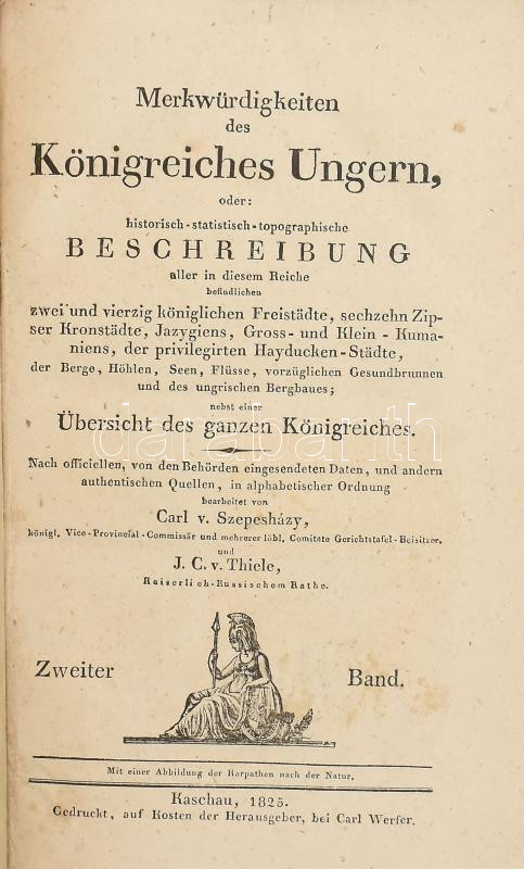 (Szepesházy, Carol.) u. J. C. Thiele. Merkwürdigkeiten des Königreichs Ungarn, oder: historisch-statistisch-topographische Beschreibung aller in diesem Reiche befindlichen 42 königl. Freistädte, 16 Zipser Kronstädte, Jazygiens, Gross- und Klein-Kumaniens, der priv. Hayduken-Städte, der Berge, Höhlen, Seen, Flüsse, vorzüglichen Gesundbrunnen und des ungarischen Bergbaues; II. Band. Kaschau, 1825. Carl Werfer. Magyarország leírása, hangsúlyozottan megjelenítve a Felvidék és a magyar fürdők. Korabeli sérült papírborítóval. / Descritption of the Kingdom of Hungary with emphasis on the Slovakian parts. + (36) p.