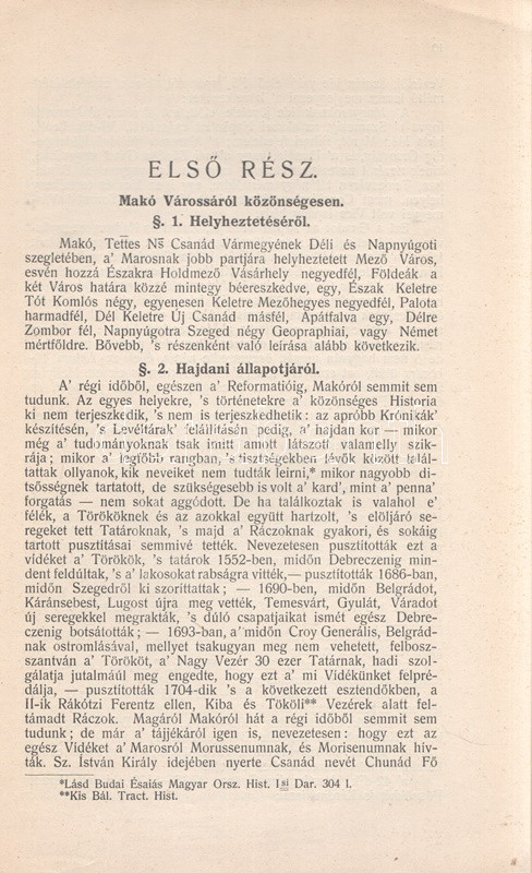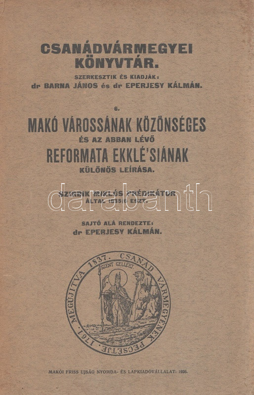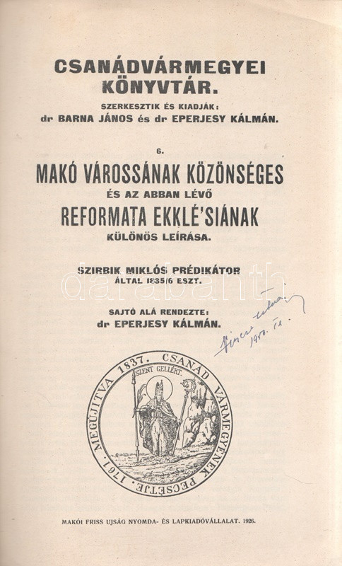 Szirbik Miklós: Makó várossának közönséges és az abban lévő reformata ekklé'siának különös leírása. Szirbik Miklós prédikátor által 1835/6 eszt[endőben]. Sajtó alá rendezte: Eperjesi Kálmán. Makó, 1926. Makói Friss Ujság Nyomda- és Lapkiadóvállalat. 1 t. (címképen a szerző hártyapapírral védett portréja) + 104 p. Egyetlen kiadás. Szirbik Miklós (1781-1853) makói református lelkész helytörténeti és egyháztörténeti dolgozata társadalomtörténeti szempontból is forrásértékűnek mondható dokumentumokat közöl, oldalszámozáson belül a város térképvázlatával. Példányunk fűzése meggyengült. Fűzve, Csanád vármegye címerével illusztrált, sérült kiadói borítóban, gerinc nélkül, a fedőborítók elváltak a könyvtesttől. Nagyrészt felvágatlan példány.