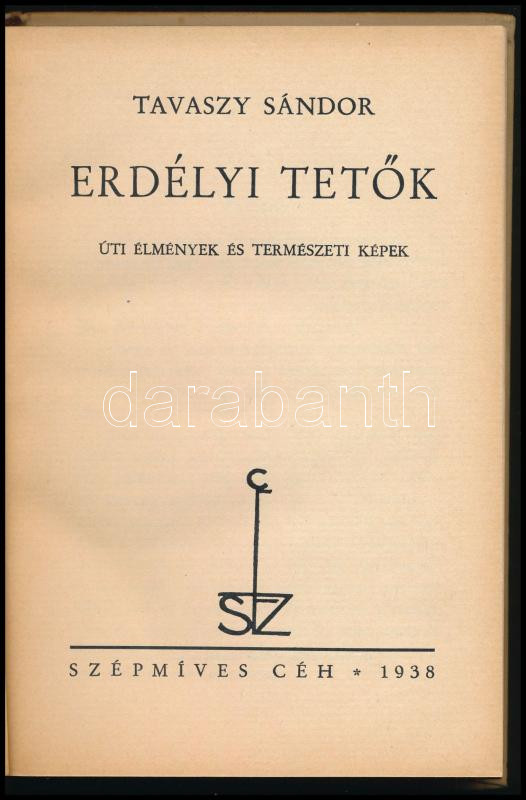 Tavaszy Sándor: Erdélyi tetÅ‘k. Úti élmények és természeti képek. [Kolozsvár], 1938, Erdélyi SzépmÃves Céh, 184+(6) p.+ 14 (fekete-fehér fotók) t. Kiadói aranyozott egészvászon-kötés, minimálisan foltos borÃtóval.