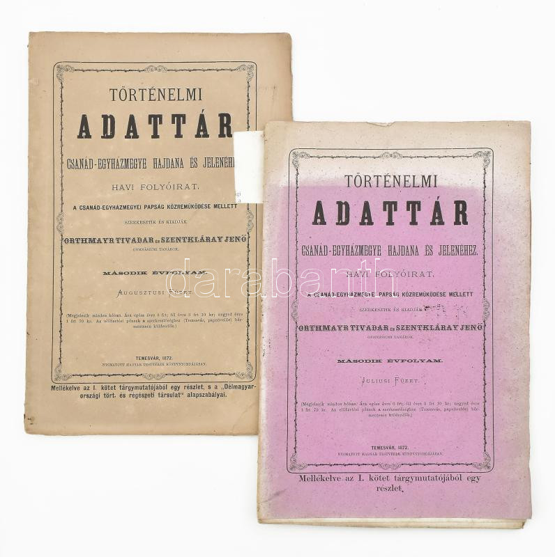 Történelmi Adattár. Csanád-egyházmegye hajdana s jelenéhez. 1872. 2. évfolyam. július, augusztus, Szerk. Orthmayr Tivadar, Szentkláray Jenő. Temesvár, 1872, Diemer Károly. Folyamatos lapszámozás. Kiadói papírborítóban