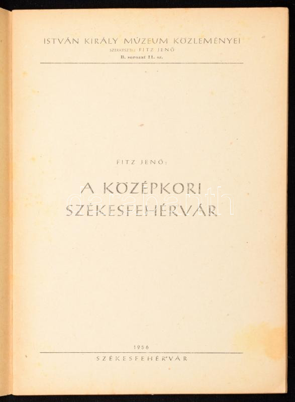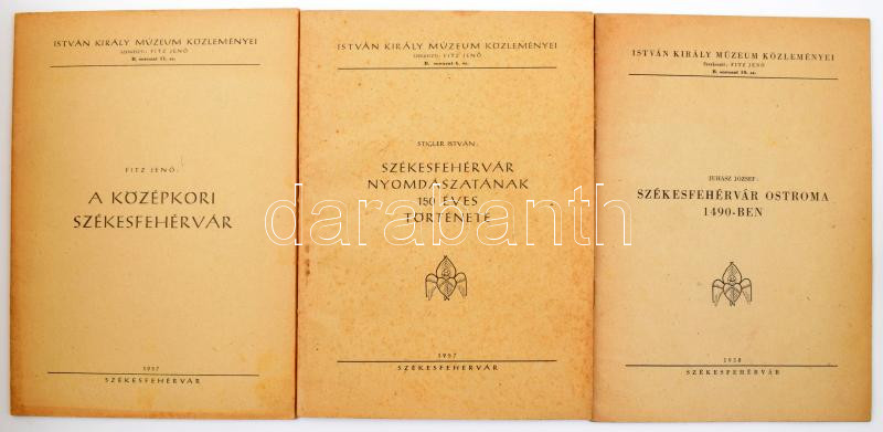 Vegyes Székesfehérvárral kapcsolatos könyvtétel, 3 db. Fitz Jenő: A középkori Székesfehérvár. István Király Múzeum Közleményei B. sor. 11. sz. Székesfehérvár, 1957, István Király Múzeum, 28 p. Kiadói papírkötés. Megjelent 2000 példányban.; Stigler István: Székesfehérvár nyomdászatának 150 éves története. István Király Múzeum Közleményei B. sor. 6. sz. Székesfehérvár, 1957, István Király Múzeum, 29+1 p.+IX t. Kiadói papírkötés, foltos borítóval. Megjelent 2000 példányban.; Juhász József: Székesfehérvár ostroma 1490-ben. István Király Múzeum Közleményei B. sor. 10. sz. Székesfehérvár, 1958, István Király Múzeum, 16 p. Kiadói papírkötés. Megjelent 2000 példányban.;