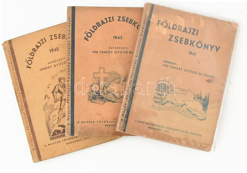 vitéz Temesy Győző (szerk.): Földrajzi zsebkönyv, 3 kötet: 1941., 1943., 1945. Bp., 1941-1945, Magyar Földrajzi Társaság, 208 p., 240 p., 256 p. Kiadói papírkötés, változó állapotban, helyenként foltos lapokkal.