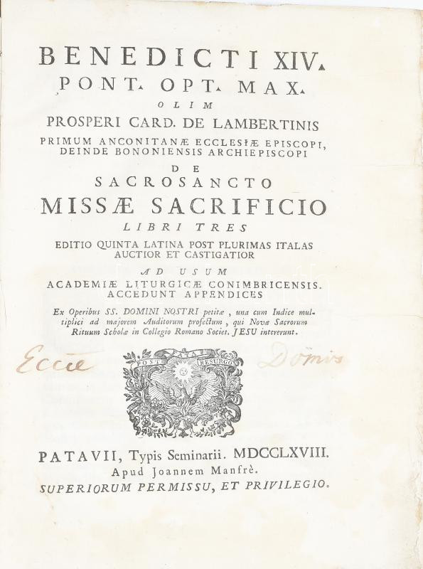 Benedicti XIV. Pont. OPT. Max. olim prosperi card. de Lambertinis primum anconitanae ecclesiae episcopi, deinde bononiensis... Libri tres. Patavii, Typis Seminarii, 1768. XXXIX+ 521 pp.Fűzve, korabeli papírborítóval