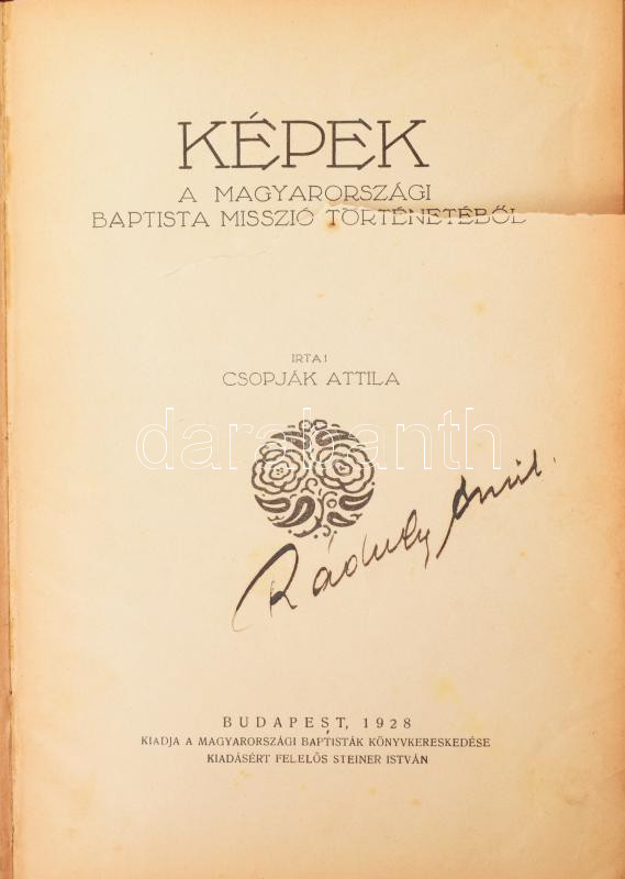 Csopják Attila: Képek a magyarországi baptista misszió történetéből. Bp., 1928, Magyaroszági Baptisták Könyvkereskedése, 133+3 p. Szövegközti fekete-fehér illusztrációkkal. Átkötött félvászon-kötés, kissé kopott borítóval, sérült címlappal.