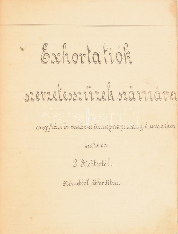 Exhortatiók szerzetesszüzek számára. Az egyházi és vásár- és ünnepnapi evangéliumaihoz csatolva. S. Richtertől németből átfordítva. Kézzel írt munka. Kopott egészvászon-kötésben, kopott, foltos borítóval, 425 p.