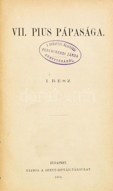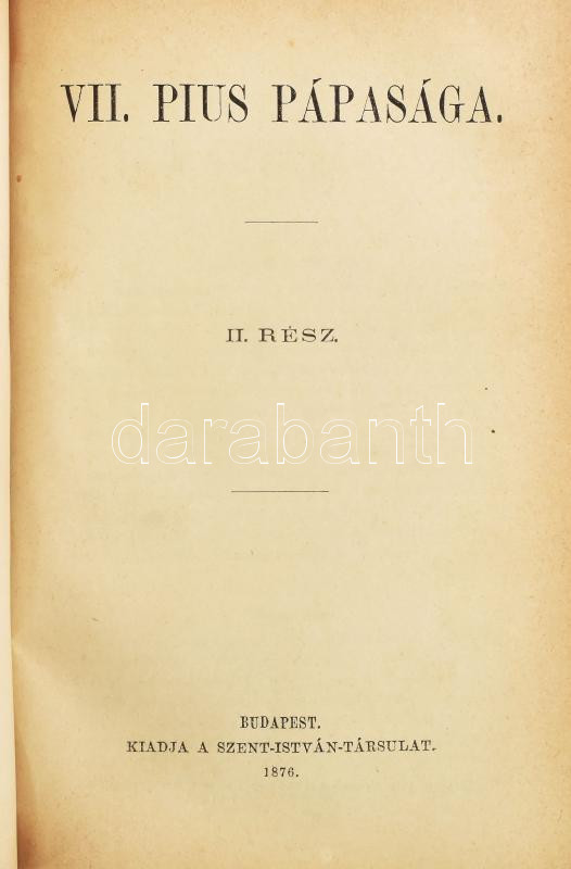 [Füssy Tamás]: VII. Pius pápasága. I-II. rész egybekötve. Házi könyvtár XXIII-XXIV. kötet. Bp., 1876, Szent István-Társulat, 4+XVI+430;+XVI+442 p. Átkötött félvászon-kötés, kissé kopott borítóval, az elülső táblán kis sérüléssel, kis hiánnyal.