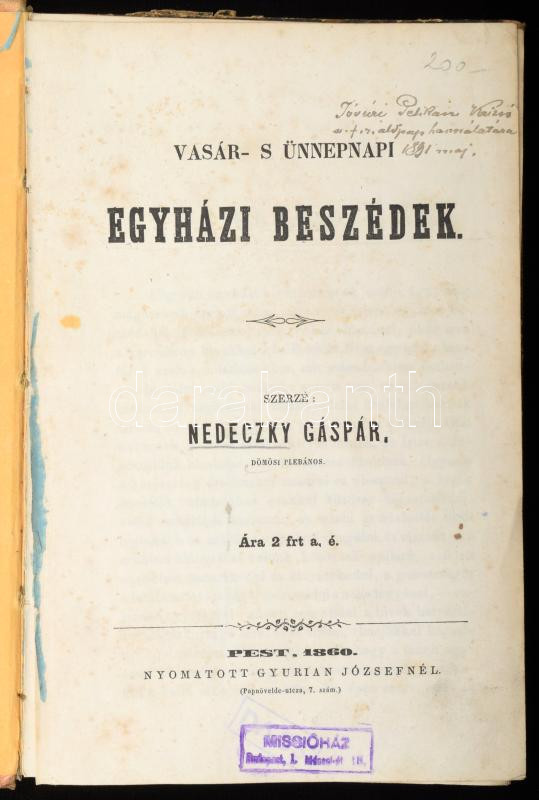 Nedeczky Gáspár: Vasár- s ünnepnapi egyházi beszédek. Pest, 1860, Gyurián József, 6+362 p. Korabeli félvászon-kötés, kopott borítóval, a címlap és az első két lap kijár, régi intézményi bélyegzésekkel, foxing foltos lapokkal, autográf bejegyzéssel a címlapon: "Tóvári Pelikán Krizsó ... ...pap használatára 1891 maj." Pelikán Ferenc Krizsó (1867-1910) ferences pap, hittanár.
