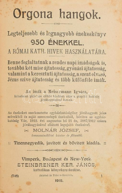 Orgona hangok. Legteljesebb és legnagyobb énekeskönyv 950 énekkel. Szerk.: Molnár József. Vimperk - Bp. és New York, 1916, Steinbrener Ker. János. Kiadói kaucsuk táblás félbÅ‘r-kötés, sérült, hiányos réz kapoccsal, az elülsÅ‘ táblán feszülettel, kopott borÃtóval, sérült gerinccel.