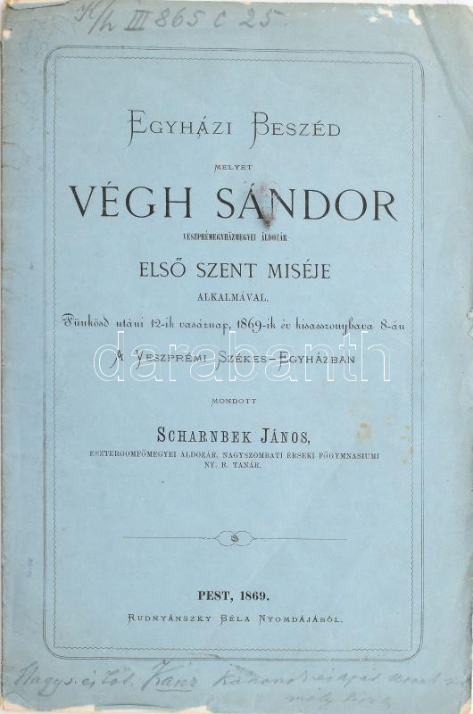 Scharnbek János: Egyházi beszéd melyet Végh Sándor veszprémegyházmegyei áldozár első szent miséje alkalmával. Pünkösd utáni 12-ik vasárnap, 1869-ik év kisasszonyhava 8-án a veszprémi székes-egyházban. Pest, 1869, Rudnyánszky Béla, 16 p. Kiadói papírkötés, szakadt borítóval, a borító hátsó sarkán gyűrődéssel, az elülső borítón bejegyzéssel.