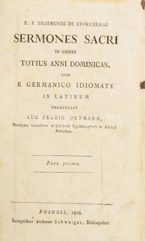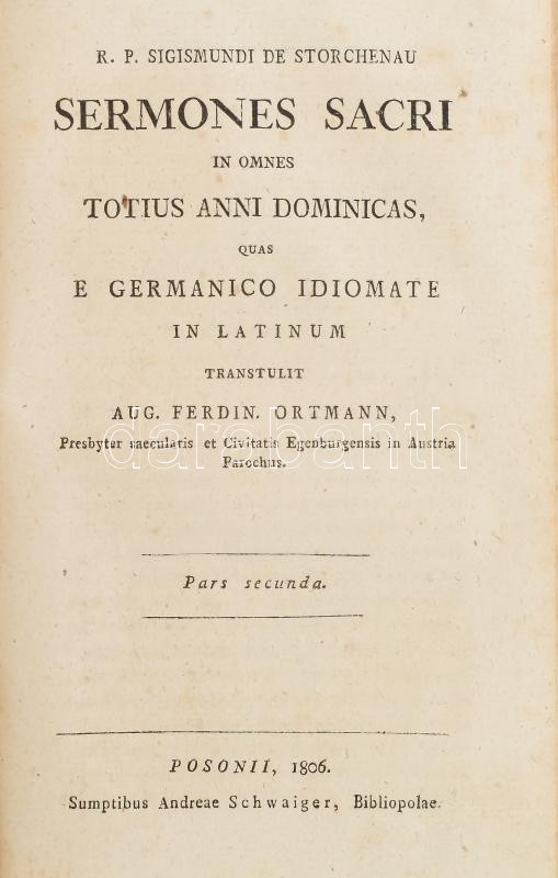 Strochenau, Sigismund[us] de: Sermones Sacri in omnes totius anni dominicas, quas e germanico idiomate in Latinum transtulit Aug. Ferdin. Ortmann. 1-2. kötet (egybekötve). Posoni, 1806, Schwaiger. 2 lev., VIII, 364 l.; 1 lev., 360 l. Korabeli, kopott kartonálásű kötésben.