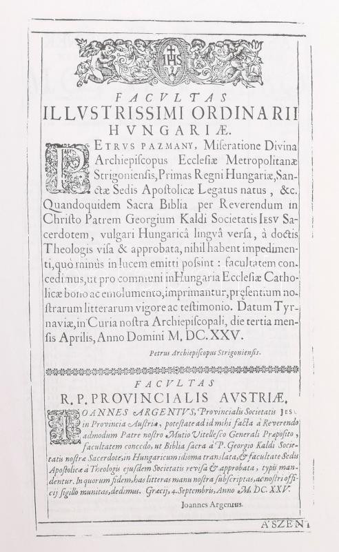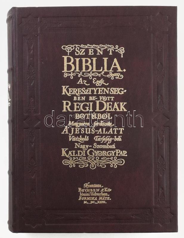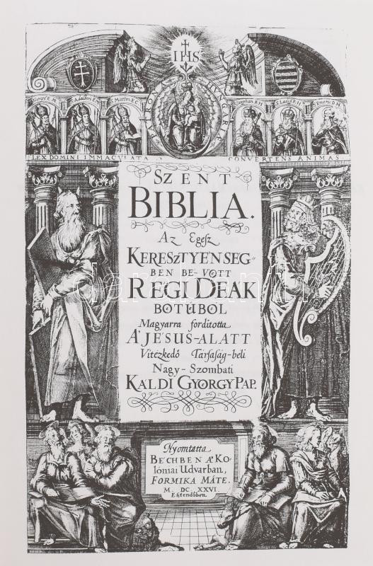 Szent Biblia. Bp., 2002, Faxsimilex Kiadó. Készült az 1626-ban kiadott Káldi Biblia hasonmás kiadványaként. Az 1626-ban, Bécsben kiadott Káldi György fordítású biblia az első teljes, katolikus biblia. Kiadói aranyozott egészműbőr-kötés, foltos lapélekkel, egyébként jó állapotban. Számozott (0395./2000) példány.