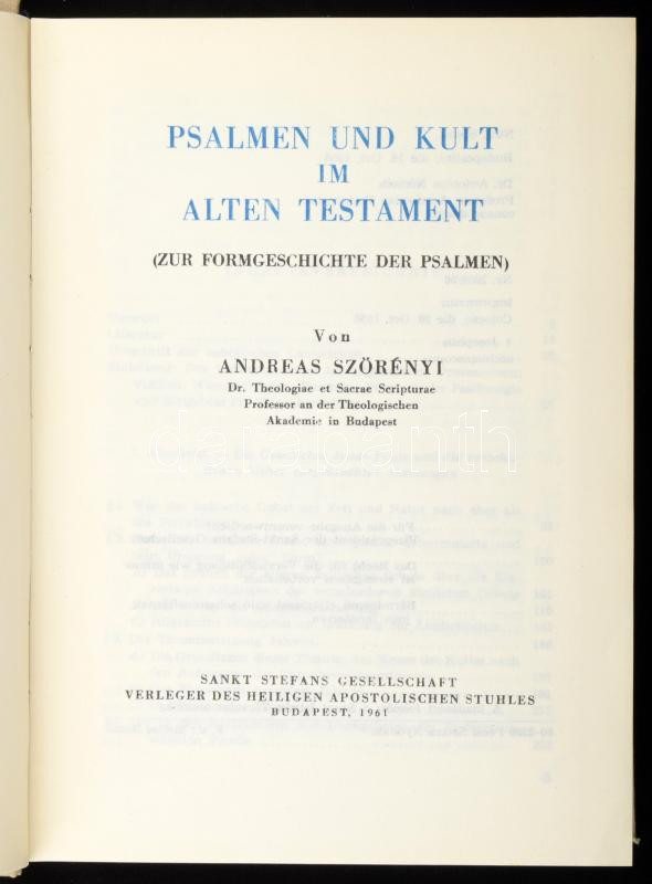 Szörényi, [Andor] Andreas: Psalmen und Kult im Alten Testament. (Zur Formgeschichte der Psalmen). Bp., 1961, Szent István-Társulat, 571 p. Német nyelven. Kiadói egészvászon-kötés.