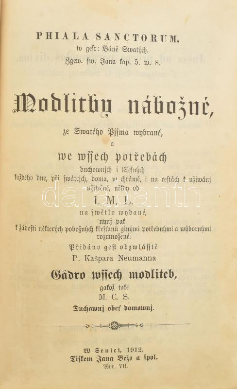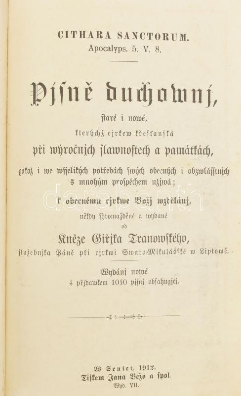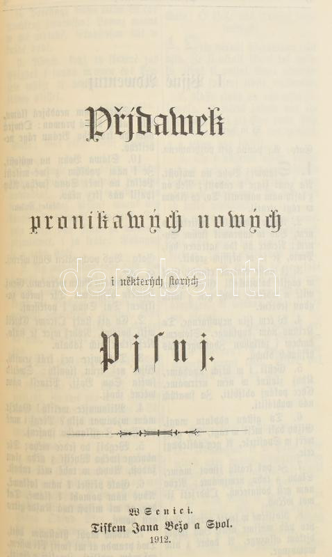 Třanovský, Jiří: Cithara sanctorum: Pjsně Duchownj, staré y nowé, kterychz cyrkew krest'anská pri wyrocnjch slawnostech a památkách ...Hozzákötve: Modlitby Nábozné ze Swatého Pjsma wybrané. Hozzákötve: Pejdawek pronikawych nowych, y nekterych starých pjsnj. W Senici (Szenice), 1912, Jana Beza, VIII+1261 [kéthasábos számozás] + 155+1+104 [kéthasábos számozás] p. Szlovák nyelven. Korabeli egészbőr-kötés, fém veretekkel, hiányos fém kapcsokkal, a borítón kis kopásnyomokkal.