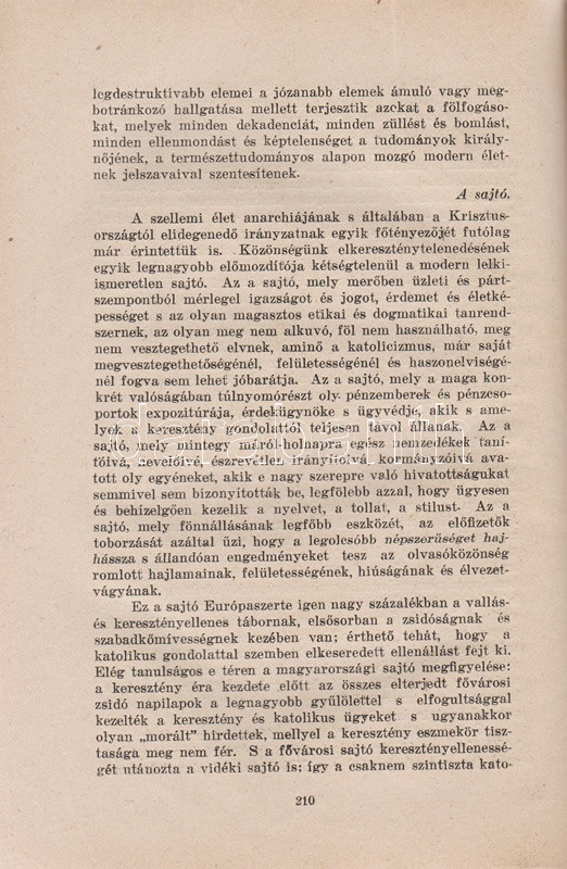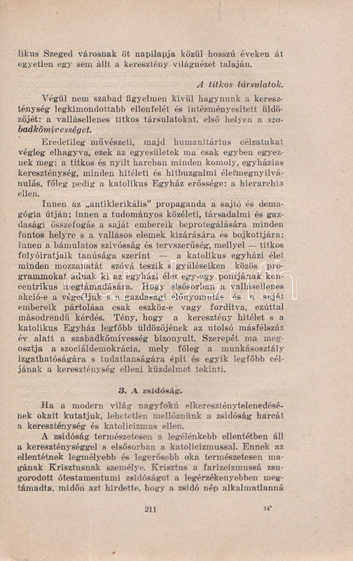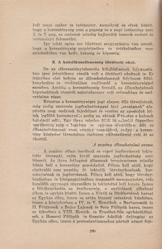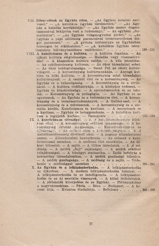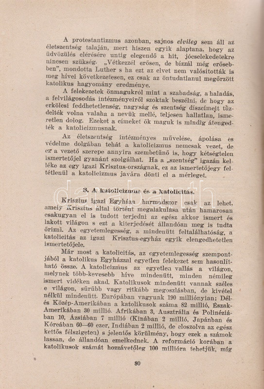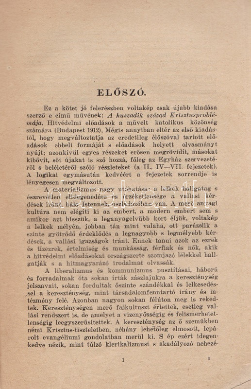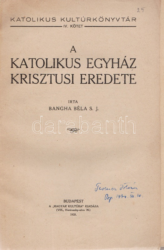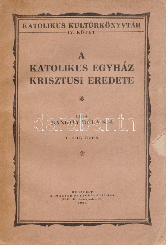 Bangha Béla: A katolikus egyház krisztusi eredete. Budapest, 1923. Magyar Kultúra (Pallas Rt. ny.) IV + 263 + [1] p. Első kiadás. Bangha Béla jezsuita szerzetes, teológus, sajtószervező (1880-1940) egyházvédelmi munkájában erősen érvel a katolikus egyház teológiai, társadalmi és tudományos igazságai mellett, vallja az egyház modernségét és felkészültségét, számot vet az egyházi kritikával, valamint bírálja a katolikus egyház ellenfeleit, különösképpen a gazdasági- és sajtóvonatkozásban. Néhány oldalon aláhúzások, néhány levélen apró szakadásnyom, egy levélen a szövegtükröt nem érintő apró hiány. (Katolikus kultúrkönyvtár, IV. kötet.) Fűzve, enyhén sérült, enyhén hiányos gerincű kiadói borítóban, az első fedőborítón apró hiány.