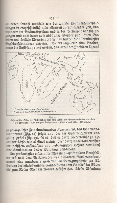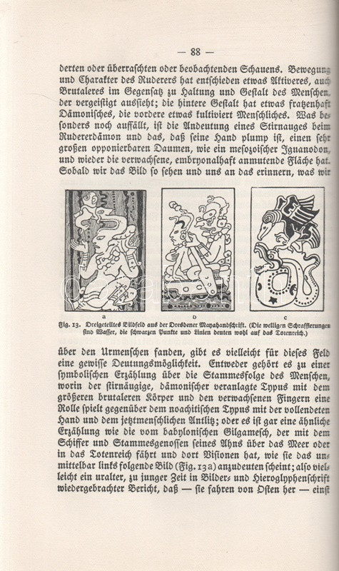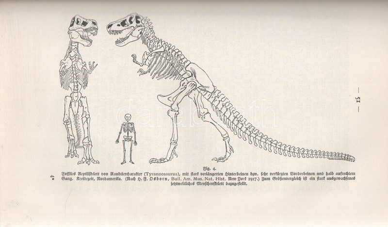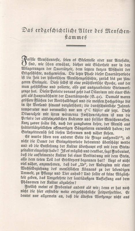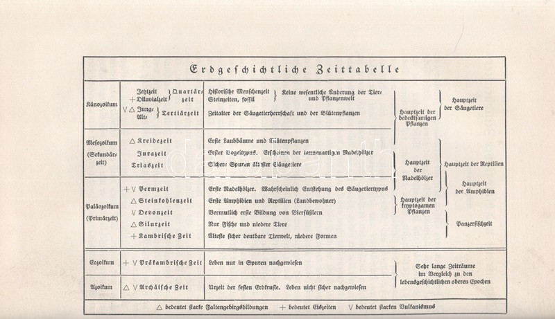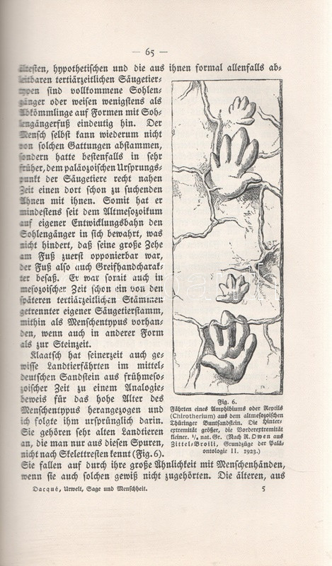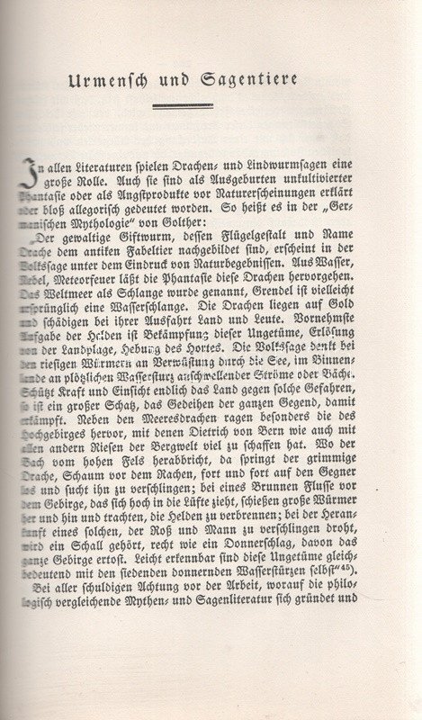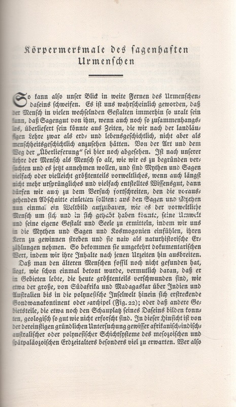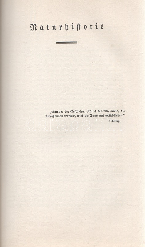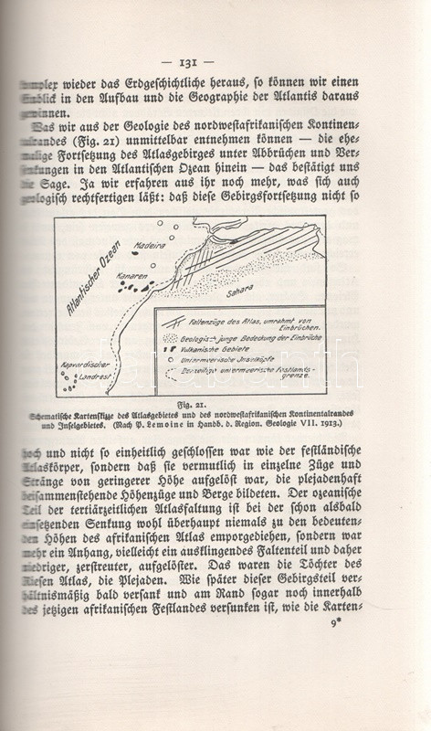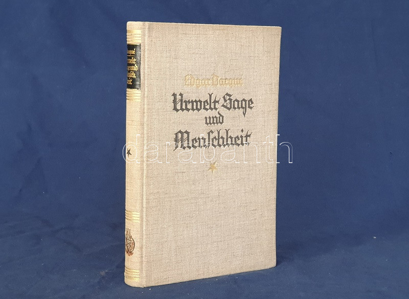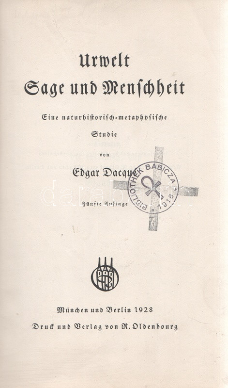 Dacqué, Edgar: Urwelt Sage und Menschheit. Eine naturhistorisch-metaphysische Studie. Fünfte Auflage. München-Berlin, 1928. Druck und Verla von R. Oldenbourg. [12] + 367 + [5] p. Edgar Dacqué (1878-1945) német paleontológus és geológus a mítoszok tükrében nyomozza az őslénytan és a földtörténeti korok kérdéseit, többek között az atlantiszi mítosz helyénvalóságának kérdésére is kitérve. Oldalszámozáson belül gazdag szövegközti illusztrációs anyaggal. A munka első kiadása 1924-ben jelent meg, példányunk az ötödik kiadásból való. A címlapon és a belív egy oldalán régi tulajdonosi bélyegzés, számos oldalon aláhúzás. Aranyozott kiadói egészvászon kötésben, felül színes festésű lapszélekkel. Jó példány.