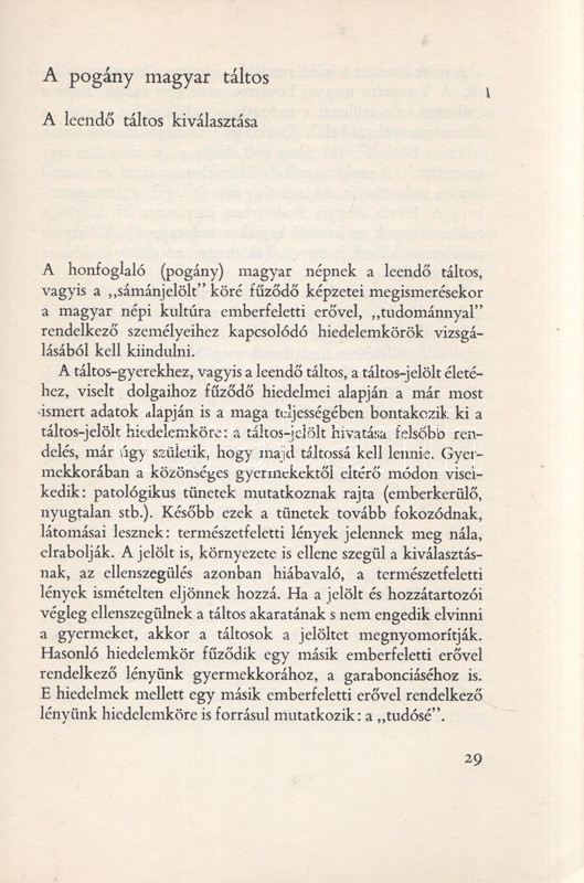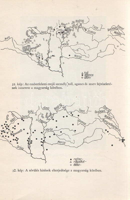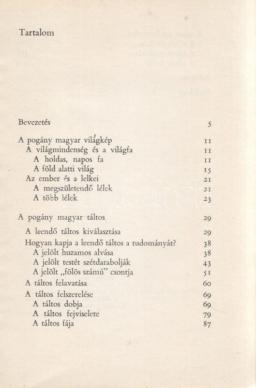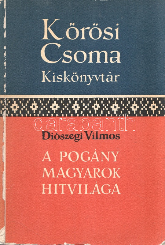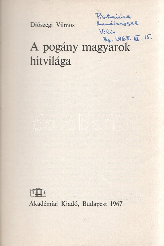 Diószegi Vilmos: A pogány magyarok hitvilága. (Dedikált.) Budapest, 1967. Akadémiai Kiadó (Akadémiai Nyomda). 142 + [6] p. + 14 t. (dupla oldalas: 41 képpel). Első kiadás. Dedikált: ,,[Vincze] Pistának barátsággal [Diószegi] Vili. Bp., 1968. III. 15.'' A tudományos világot régóta foglalkoztatja a pogány magyarok hitvilága. A szerző összehasonlító vizsgálatok alapján közelít a kérdéshez: a magyar népi szellemi kultúra ide tartozó területeit összeveti a rokon népek és a magyarokkal rokon kultúrájú népek folklórjával, s a közös motívumok történeti párhuzamai alapján bizonyítja, hogy a magyar szellemi kultúra etnikus sajátságait nem a honfoglalás után vettük át a szomszéd népektől. Ezzel a módszertani elvvel bontja ki a pogány magyar világképét, a természetfeletti világról alkotott felfogásukat, s e természetfeletti erőkkel ,,érintkező" személy, a sámán alakját. A sámánokról szóló anyagot szibériai és mongóliai népek körében is tanulmányozta. Prov.: Vincze István. [Vincze István (1922-1982) néprajztudós, 1955-től a Néprajzi Múzeum munkatársa, 1980-től osztályvezetője. Főként szőlészet- és borászattörténettel foglalkozott.] (Kőrösi Csoma kiskönyvtár 4.) Fűzve, enyhén kopott kiadói borítóban, jó példány.