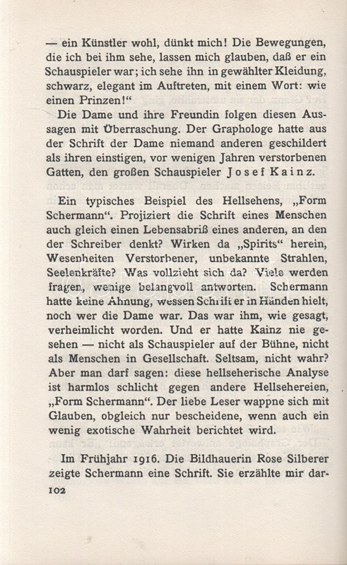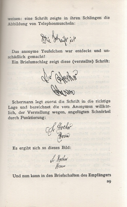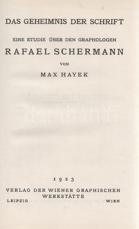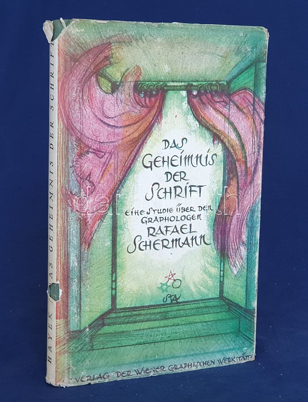 Hayek, Max: Das Geheimnis der Shrift. Eine Studeie über den Graphologen Rafael Schermann. Leipzig-Wien, 1923. Verlag der Wiener Graphischen Werstätte (Druck der Offizin der Waldheim-Eberle AG., Wien). 1 t. (címkép) + 159 + [1] p. + hibajegyzék. Első kiadás. Max Hayek (1882-1944) német újságíró, műfordító és grafológus tanulmánya Rafael Schermann grafológus szakmai eredményeiről, oldalszámozáson belül számos szövegközti grafológiai ábrával. Aranyozott gerincű, feliratozott kiadói félvászon kötésben, színes, illusztrált, enyhén sérült kiadói védőborítóban. Jó példány.