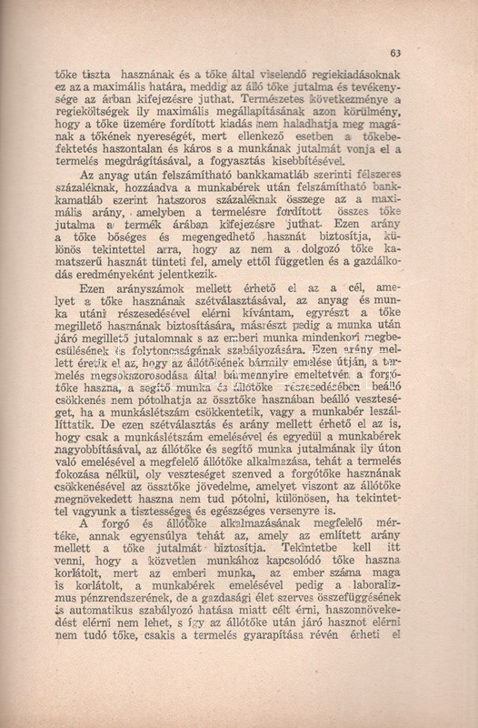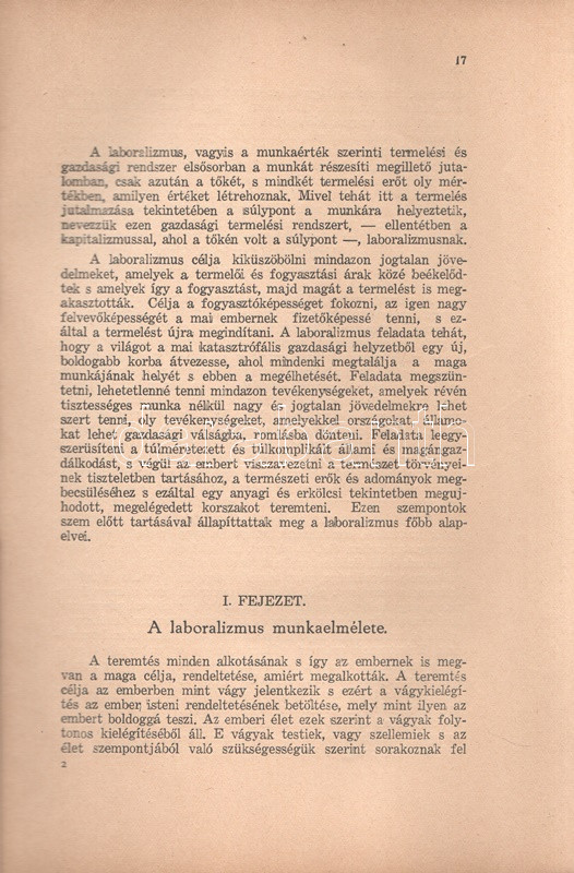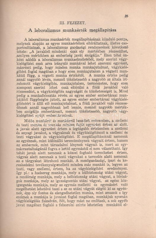 Horváth András: A laboralizmus. (Munkaérték szerinti gazdasági rendszer.) Budapest, 1934. Gergely R. könyvkereskedése (Kellner és Kiss Törekvés nyomdája). 101 + [1] p. + hibajegyzék. Egyetlen kiadás. Horváth András budapesti rendőrkapitány közgazdasági értekezése a gazdasági világválság tapasztalatai nyomán a kapitalizmus korábbi gyakorlatát megújító, munkaérték alapú gazdaságot szorgalmaz, mely elveti a kereslet-kínálat elvének mindenhatóságát, ám a magántulajdon érdekét (és bizonyos határon belül a nem spekulatív tőke érdekét) tiszteletben tartja, így semmiképpen nem mondható szocialista jellegű gazdasági rendszernek. A munkaérték meghatározásánál tekintetbe vesz egy újfajta munkaosztályozást: a munka lehet létrehozó (mezőgazdaság, bányászat, kreatív szellemi munka), átalakító (ipar) és közvetítő jellegű (kereskedelem, pénzügy), ám az osztályharcos elméletekkel szemben a három nagy csoport elkülönítésének oka kizárólag a munkaérték ott hatályos szabályának megállapítása. A gazdaságelméleti munka a korabeli sajtóban némi visszhangot is keltett. (Köztelek, 1934. szeptember 23.) A kissé elszíneződött címoldalon régi tulajdonosi bejegyzés. BOEH VI: 0. Fűzve, kiadói borítóban. Körülvágatlan, jó példány.