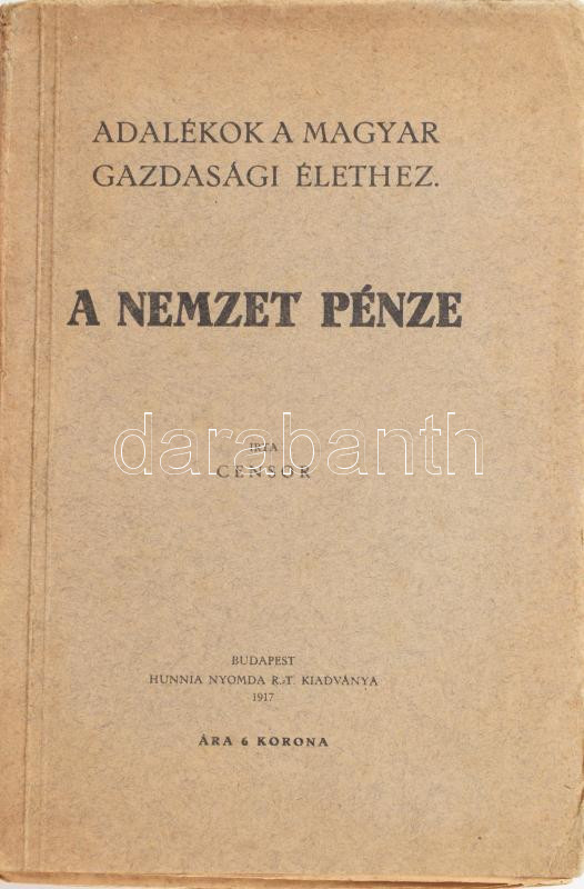 [Jellinek Henrik] Censor: A nemzet pénze. Adalékok a magyar gazdasági élethez. Bp., 1917, Hunnia, 392+8 p. Kiadói papírkötés, kissé kopott borítóval, a gerincen kis szakadással, néhány lapon bejelöléssel.