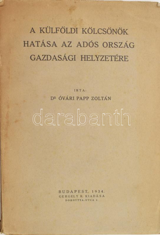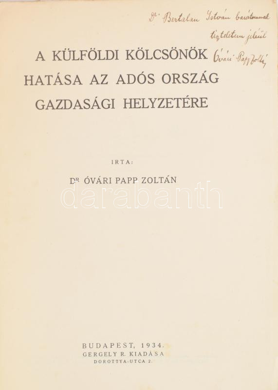 Óvári Papp Zoltán: A külföldi kölcsönök határa az adós ország gazdasági helyzetére. A szerző, Óvári Papp Zoltán által DEDIKÁLT példány! Bp., 1934, Gergely R.,(Pécs, Dunántúl Pécsi Egyetemi-ny.), XV+1+231+1 p.