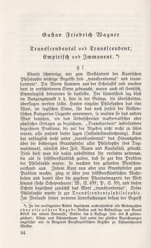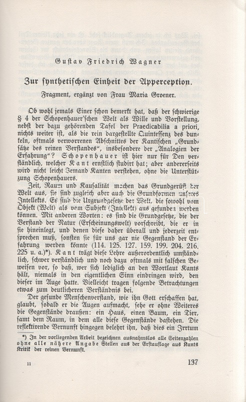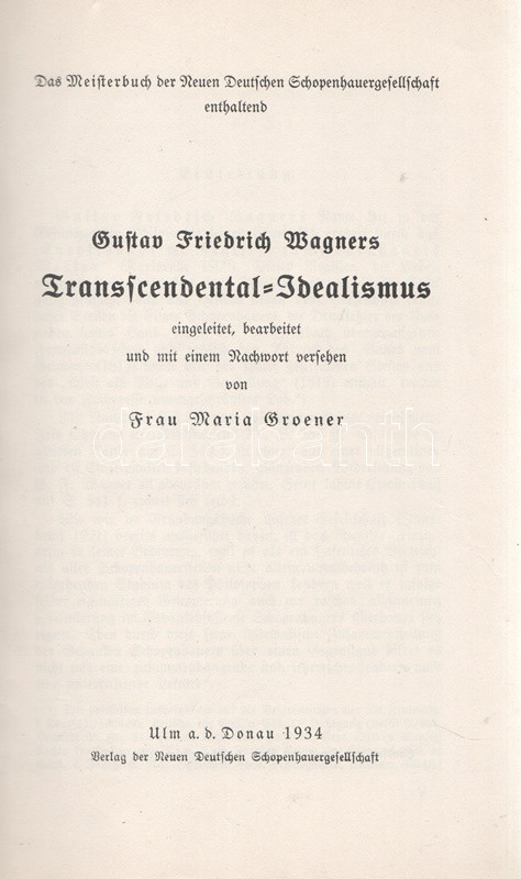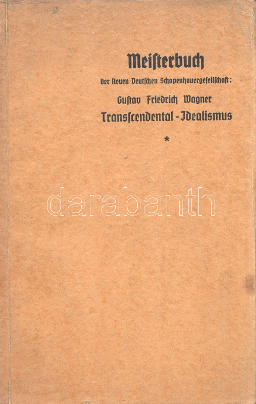 Gustav Friedrich Wagner (1848-1917) német filológus, az első rendszeres Schopenhauer-bibliográfia (1909) összeállítója. Wagner ismeretelméleti kötetének végén Maria Groener tisztázza a transzcendentális idealizmus filozófiájának viszonyát a kereszténységhez. Az első fedőborító verzóján régi kereskedői könyvjegy.