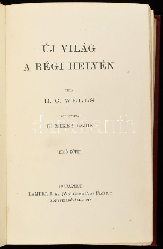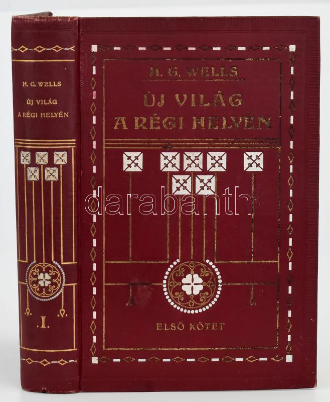 Wells, [Herbert George]: Új világ a régi helyén. I. köt. Ford.: Mikes Lajos. Bp., é.n. (cca 1910-1915), Lampel R. (Wodianer F. és Fiai), 278+(2) p. Kiadói aranyozott, festett, szecessziós egészvászon-kötés, a borÃtón némi kopással, néhány kissé foltos lappal, egyébként jó állapotban.