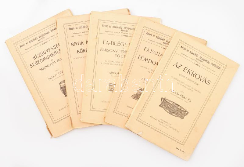 Ardos Frigyes: Nevelő és műkedvelő kézügyességi munkálatok könyvtára. Szerk.: - -. 1-5. füzet. Teljes sorozat! 1.: Az ékrovás (kristálymetszés). 71 szöveg közé nyomott ábrával és 10 mintalappal, 63+1 p.; 2.: Fafaragások és fémdomborítás. 100 szöveg közé nyomott ábrával és 7 mintalappal, 88 p.; 3.: Fa-beégetések és bársony-fényvasalás, égetés. 60 szöveg közé nyomott ábrával, 6 fekete és 2 színes nyomású mintalappal, 64 p.+ 2 t.; 4.: Batik munkálatok és bőrdomborítás. 70 szöveg közé nyomott ábrával és 6 mintalappal, 80 p. ; 5.: Kézügyességi segédmunkálatok és használatos fanemek, 88 p.; Bp., 1911, Révai és Salamon. Kiadói papírkötések, az 1. füzet szakadt borítóval, a 3. kötet borítója gerincén kis szakadással, a 4. kötet borítója a gerincén szakadt és a könyvtest elvált a borítótól, az 5. kötet borítója a gerincén szakadt. A teljes sorozat együtt nagyon ritka!