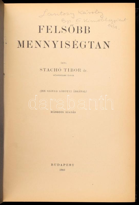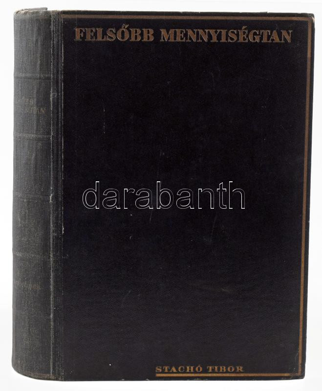 Dr. Stachó Tibor: Felsőbb mennyiségtan. Bp.,é.n.,(Wodianer F. és Fiai-ny.), 623 p. Kiadói egészvászon-kötés, minimálisan kopott borítóval. A Ludovika Akadémia magas színvonalú matematika tankönyve volt.
