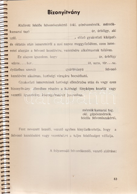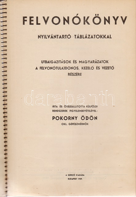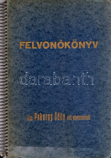 Felvonókönyv nyilvántartó táblázatokkal. Útbaigazítások és magyarázatok a felvonótulajdonos, kezelő és vezető részére. Összeállította külföldi rendszerek figyelembevételével: Pokorny Ödön. Budapest, 1939. Szerző (Kellner Albert ny.) [8] + 177 (helyesen 171) + [1] p. Egyetlen kiadás. Oldalszámozáson belül műszaki űrlapokkal, egész és fél oldalas, képekkel illusztrált korabeli hirdetésekkel, a felvonókezelés műszaki és jogi környezetének leírásával. Három oldalon helyesbítő felülragasztások, a hátsó fedőtábla belső oldalán a kitöltött űrlapok tárolására szolgáló felragasztott, feliratozott tok. Spirállal fűzve, aranyozott kiadói borítóban. Jó példány.