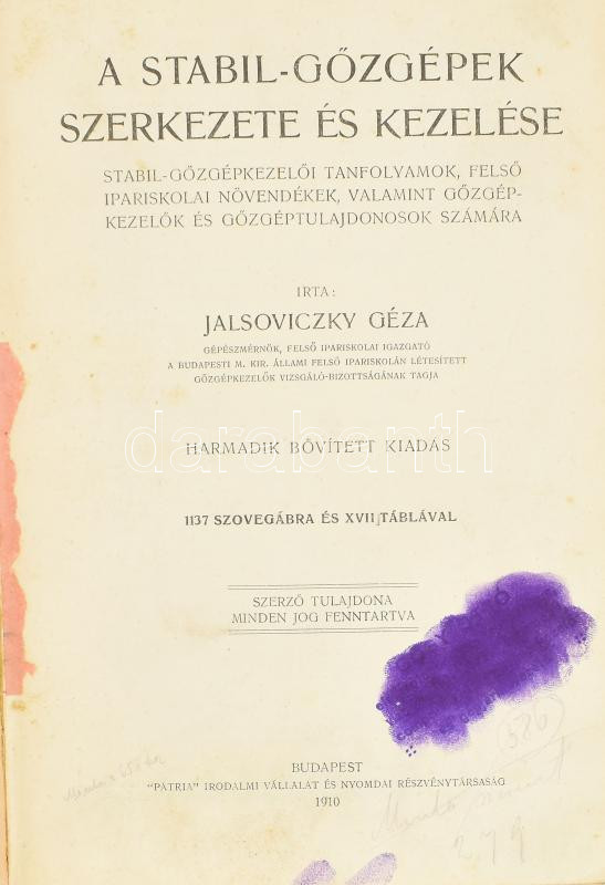 Jalsoviczky Géza: A stabil-gőzgépek szerkezete és kezelése. Stabil-gőzgépkezelői tanfolyamok, felső ipariskolai növendékek, valamint gőzgépkezelők és gőzgéptulajdonosok számára. Bp., 1910, "Pátria", XII+695+1+3+1 p.+XVII t. 3., bővített kiadás. Fekete-fehér képanyaggal illusztrált. Átkötött félvászon-kötésben, foltos címlappal.