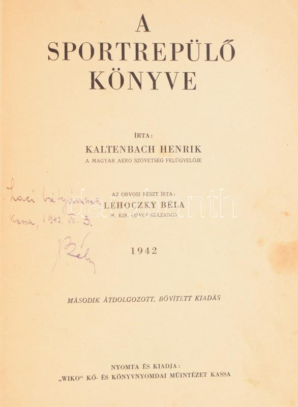Kaltenbach Henrik - Lehoczky Béla: A sportrepülő könyve. Az orvosi részt Lehoczky Béla. Az egyik szerző, Lehoczky Béla által DEDIKÁLT példány! Kassa, 1942, "Wiko", 246+13 p.+1 (kihajtható táblázat) t. Második, átdolgozott, bővített kiadás. Átkötött félvászon-kötés.