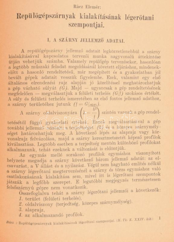 Rácz Elemér: Repülőgépszárnyak kialakításának légerőtani szempontjai.;
